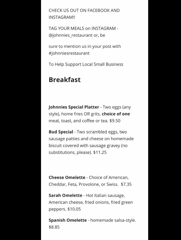 Welcome to Johnnie's Restaurant, a family-owned gem in Mays Landing, NJ, where great food meets a warm, welcoming atmosphere. Enjoy indoor and outdoor dining or opt for convenient takeout. Our menu features breakfast favorites, traditional American dishes, and local specialties, all served with a side of excellent coffee. Perfect for solo diners and families alike, we offer a relaxed ambiance with accessible seating and amenities. Join us for brunch, lunch, or a sweet dessert, and experience why our community loves Johnnie’s. Reservations are accepted, and we’re ready to make your visit memorable!